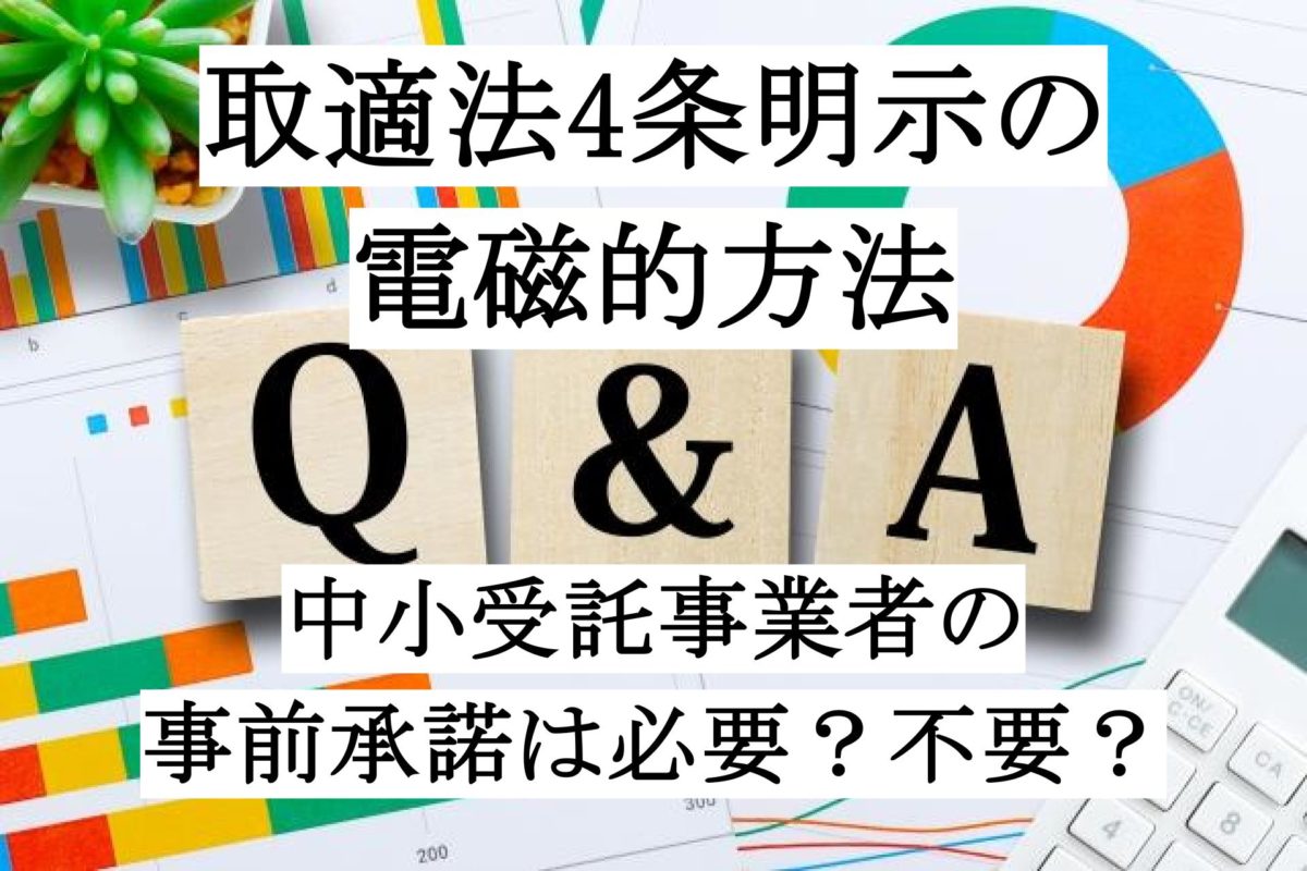 取適法4条明示(旧下請法3条書面)の電磁的方法は事前承諾が必要?更新日:2026年1月15日公開日:2026年1月14日業務委託契約と取適法よくある質問 取適法の4条明示(旧下請法の3条書面)を電子メール・電子契約等などの電磁的方法でおこなう場合、委託事業者(旧親事業者)は、中小受託事業者(旧下請事業者)の事前の承諾は必要でしょうか? 取適法の委託事業者がおこなう電磁的方 […] 続きを読む