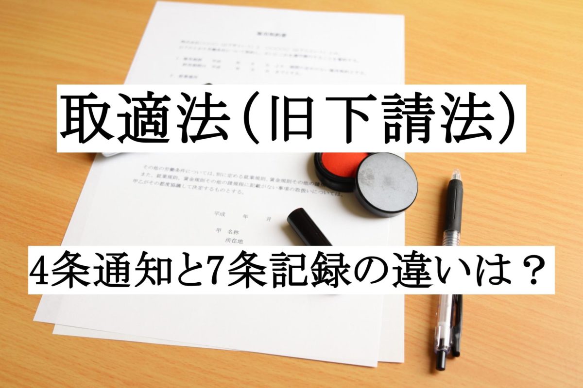 このページでは、主に取適法(製造委託等に係る中小受託事業者に対する代金の支払の遅延等の防止に関する法律)の委託事業者(旧親事業者)向けに、いわゆる4条明示と7条記録の違いについて解説しています。